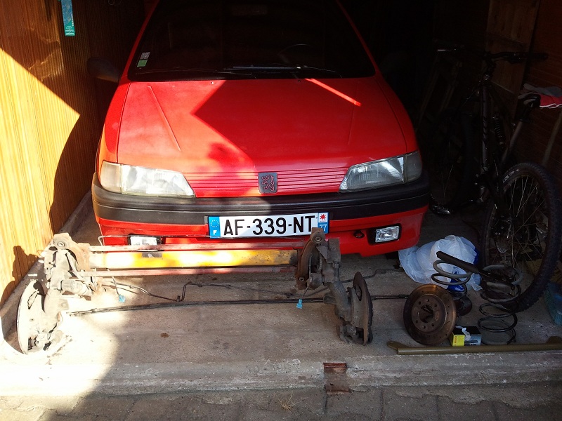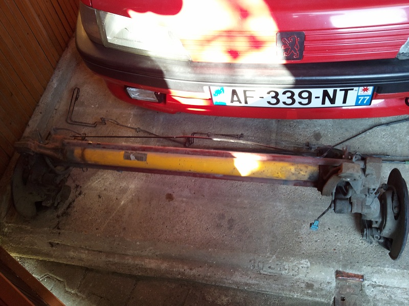 Hey les amis bon apres une petite periode de repos (les vacances sa c'est bon :dentier: )j'ai acquis un train arriere complet de saxo vts 30000 km il est tout neuf :inlove: avec les tuyaux et les cables ainssi que le levier de frein a main :bien: avec ça une paire de ressort eibach -35 une barre inferieur une paire de disques AR grn avec plaquettes neuves ;)