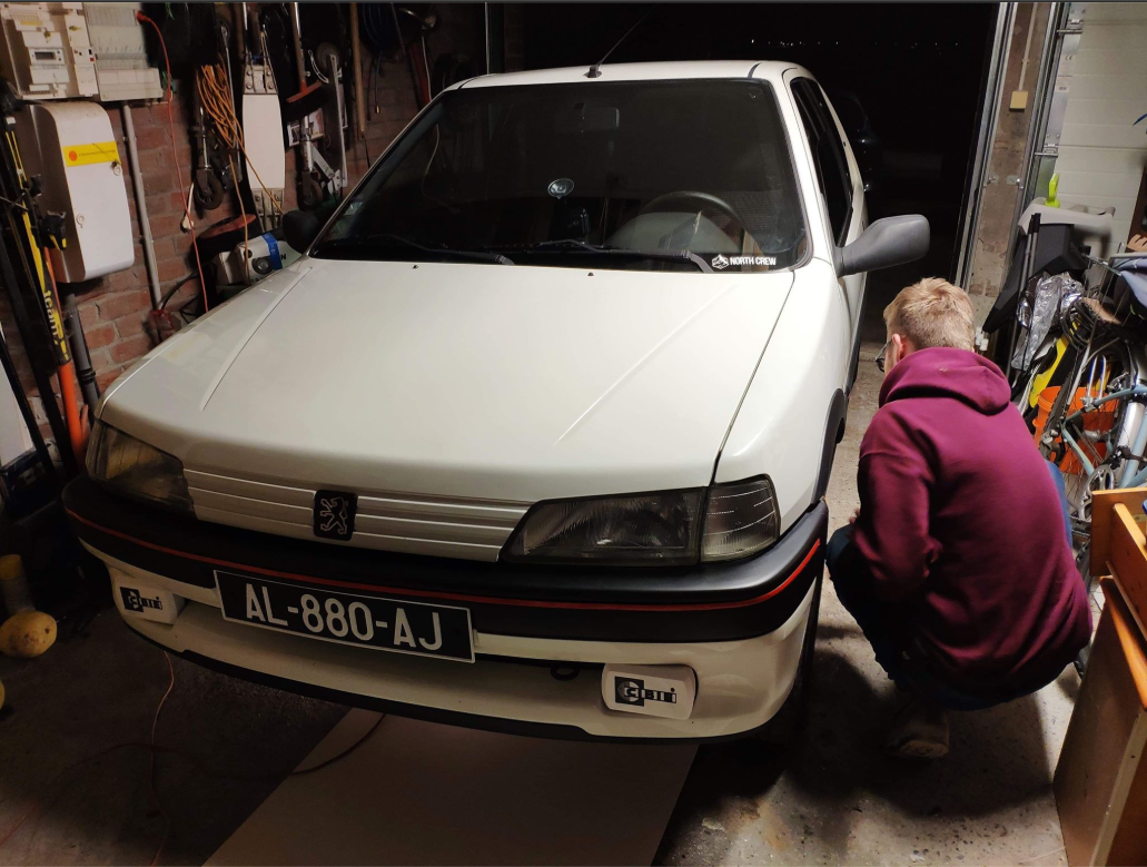 Donc c'est une 106 XSi Blanc Meije de 1993 (catalysée). Vitres électriques et centralisation en options. Intérieur bleu, le moteur (soupapes, pistons) à été refait à neuf il y a quelques années.