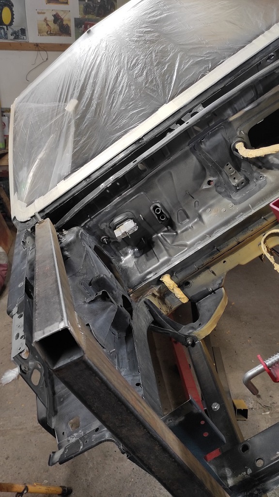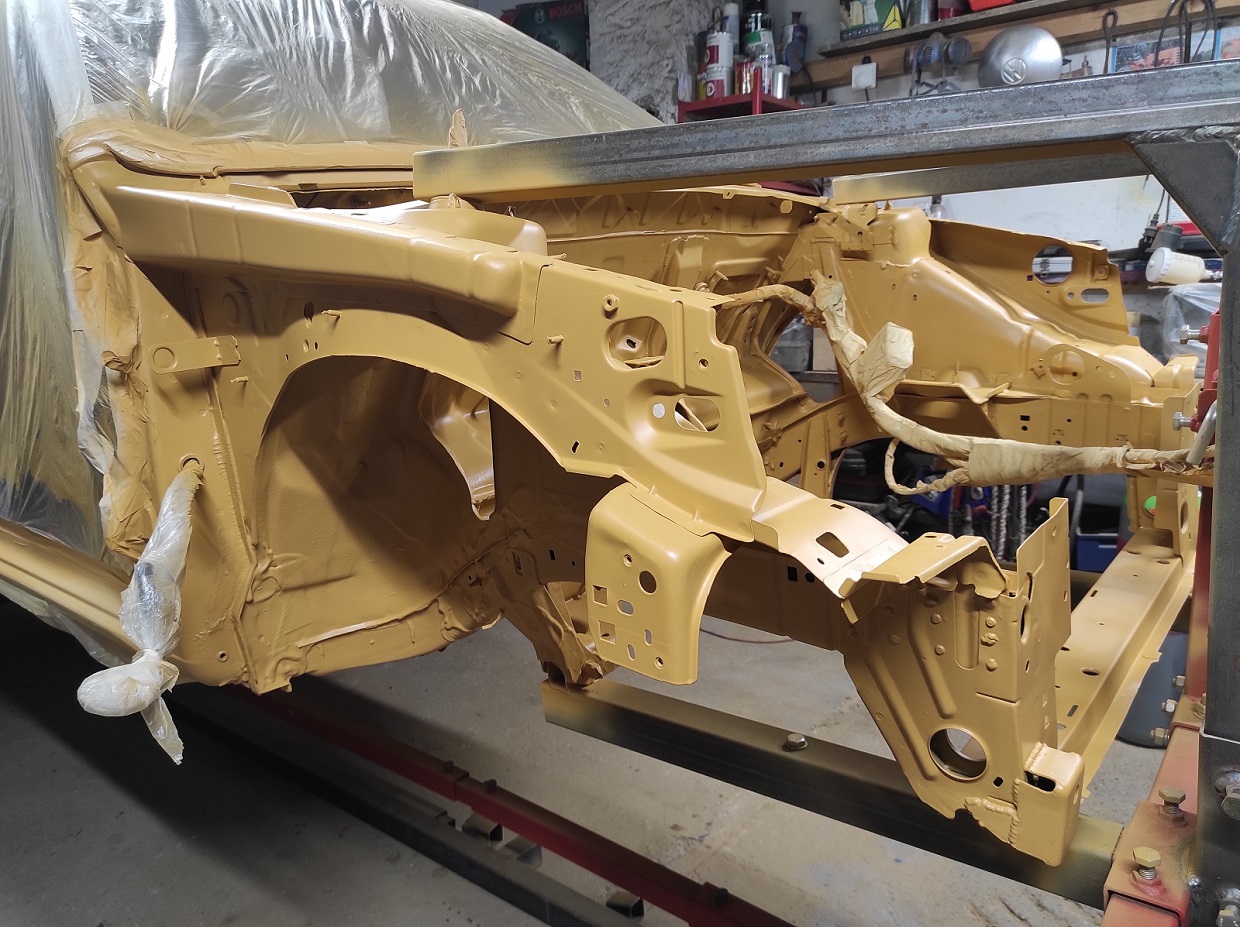 L'étape du traitement de la corrosion( qui s'avérait vraiment légère sur ma voiture) est terminée, et toute la caisse a été peinte avec du primaire. Je vais remettre de la colle structurale dans certains endroit pour optimiser un peu, et j'attaquerai l'antigravaillon noir partout sous la caisse, les passages de roues et la traverse avant (souvent criblée d'impacts).