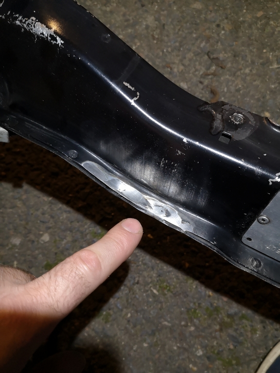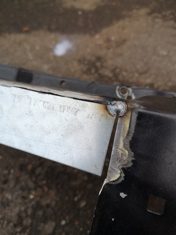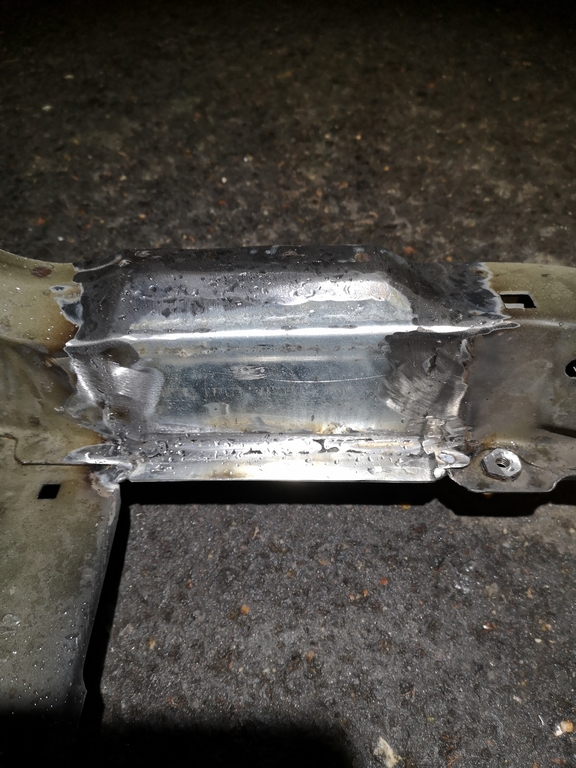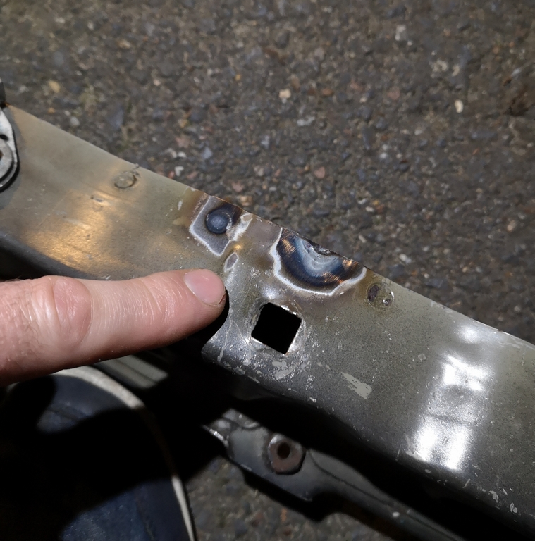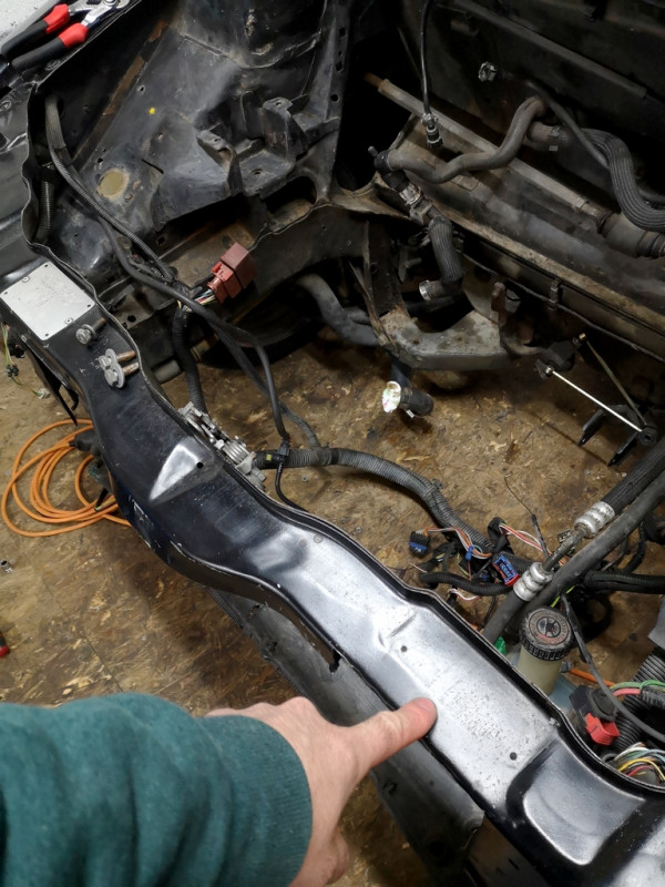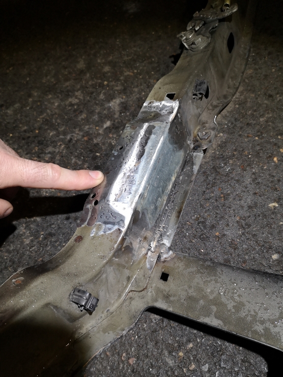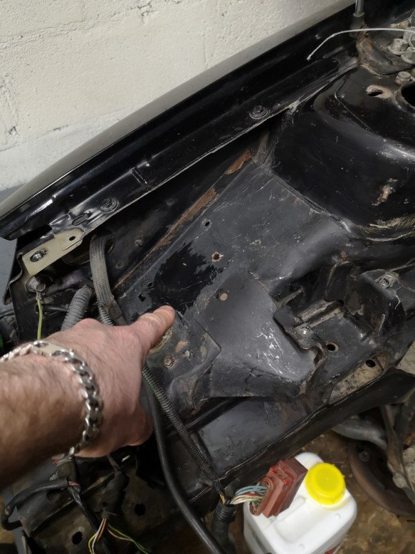 Suite ET,Je continu dans les choses qui ne vont pas coté compartiment moteur:1/ Coté traverse supérieure:Elle est découpé à 3 endroits, je vais devoir remettre de la tôle, pour quelle redevienne comme à l'origine.
