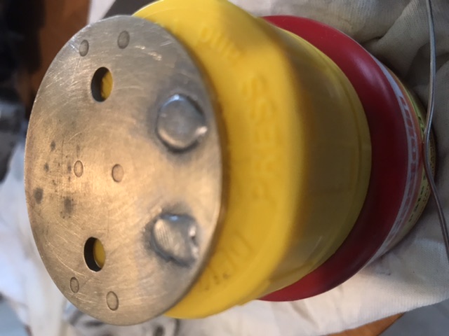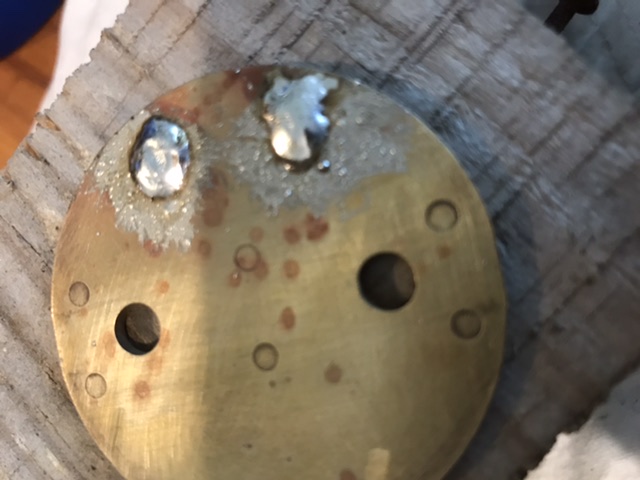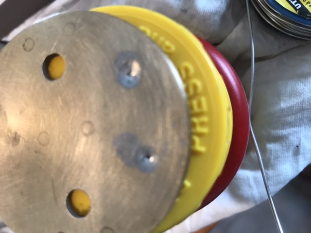 Démontage du volet et bouchage des trous à l’étain, j’avais en ma possession une lampe à souder de l’étain et un décapant spécial pour souder à l’étain, donc nettoyage, décapage et chauffe puis mise en place de l’étain qui s’est parfaitement logé dans les trous.