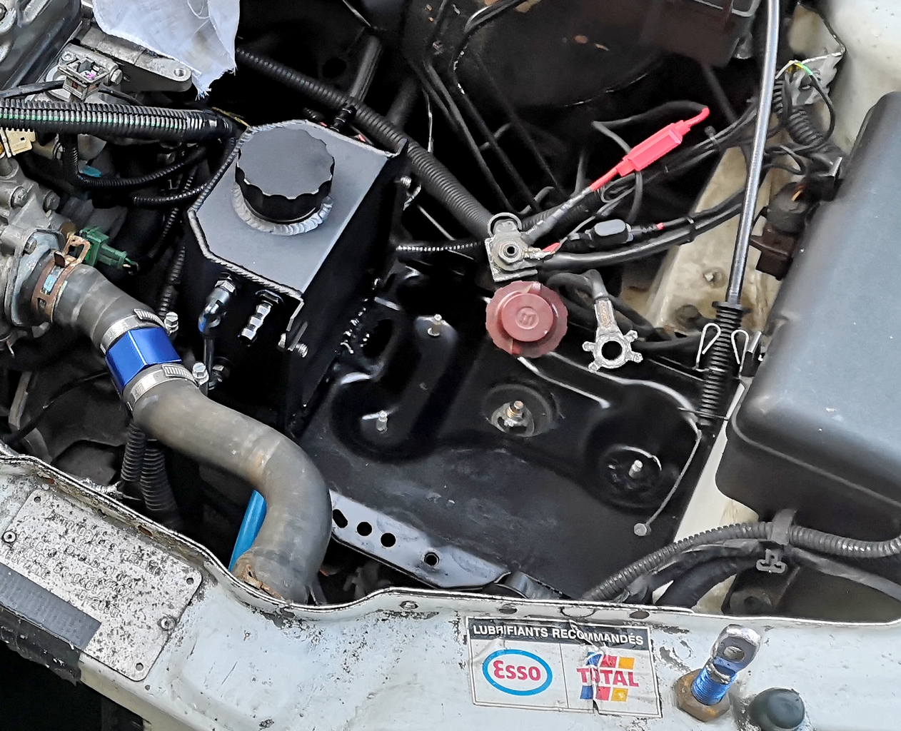 Ici en photo, mon nouveau bocal de recyclement des vapeurs d'huiles/eaux, placé à coté de la batterie,