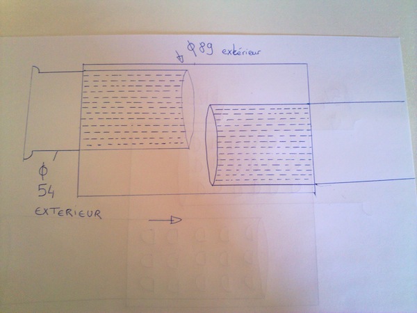 Comme tu peux voir j'ai noté les diamètres, je pense que le corps en 89 (ou aussi possible en 114) serait trop petit, et les deux tubes a peine décalé ce serait pas bon, alors du coup, j'ai pensé a du 125. Sinon, que je chope une plaque et que je le fasse ovale. D'ailleurs si un jour ça peut aider quelqu'un pour choper une plaque ovale, j'irais chez le ferailleur du coin que je connais un peu, et ça se trouve il peut en fournir une contre l'échange d'une bouteille, ou un ti billet ;)