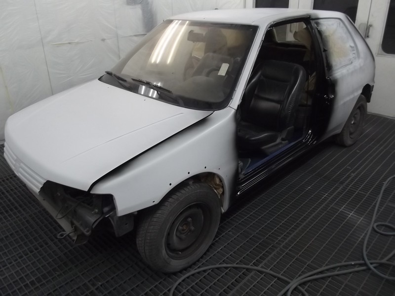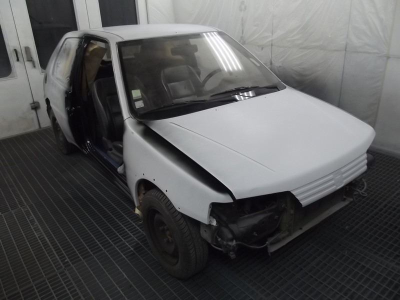 Et voici la voiture après quelques heures de redressage, de masticage, de ponçage et d'apprêt ! :)