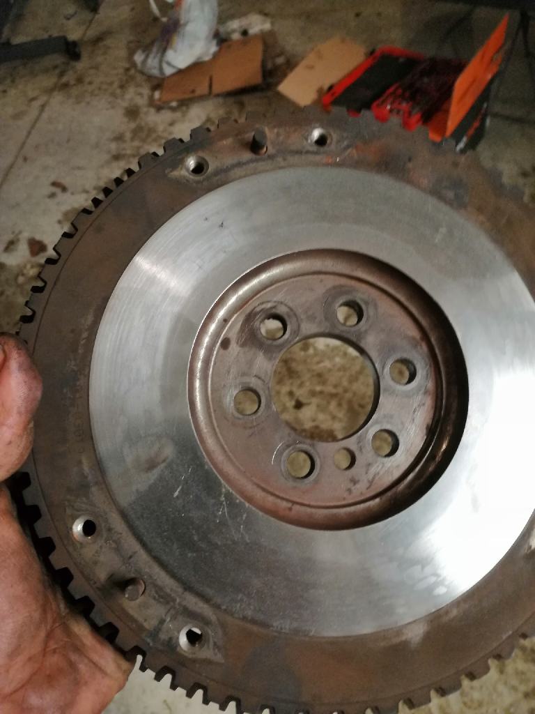 Puis repose du volant (les 3 trous que l'on voit sur la photo sont ceux d'équilibrage pf :bien:)pour rappel le volant est repassé à l'usinage pour redressage de la face car les rivets d'embrayage lui avaient dit bonjour