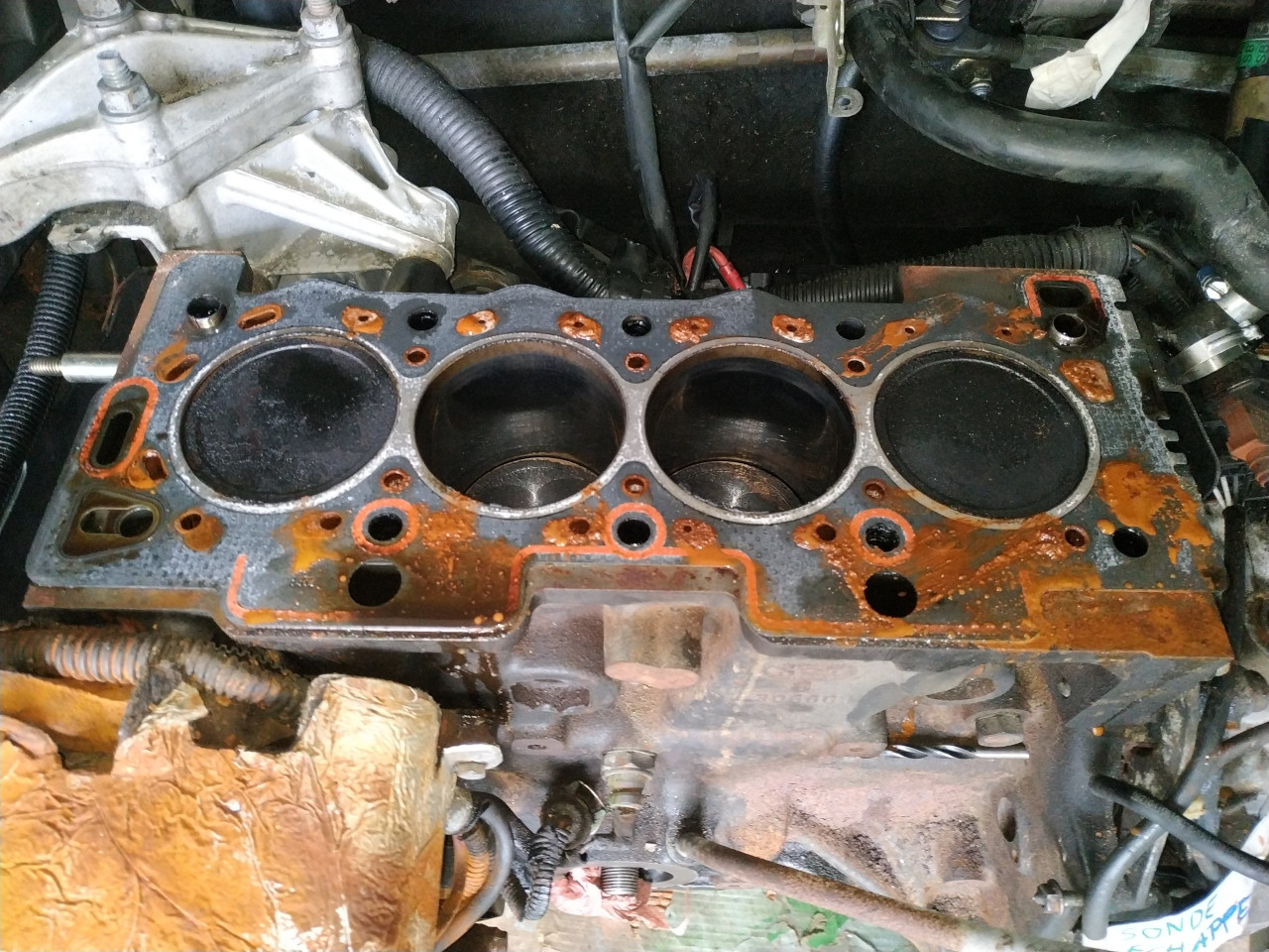 En passant j'ai remarqué que des gaz d'échappement sortaient au niveau du collecteur d'échappement, mais je ne sais pas si ça vient du joint de culasse ou du collecteur.