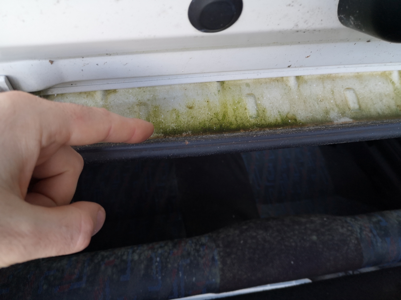 Ici en photo, le trou d’évacuation de l'eau de la baie de pare brise coté conducteur.