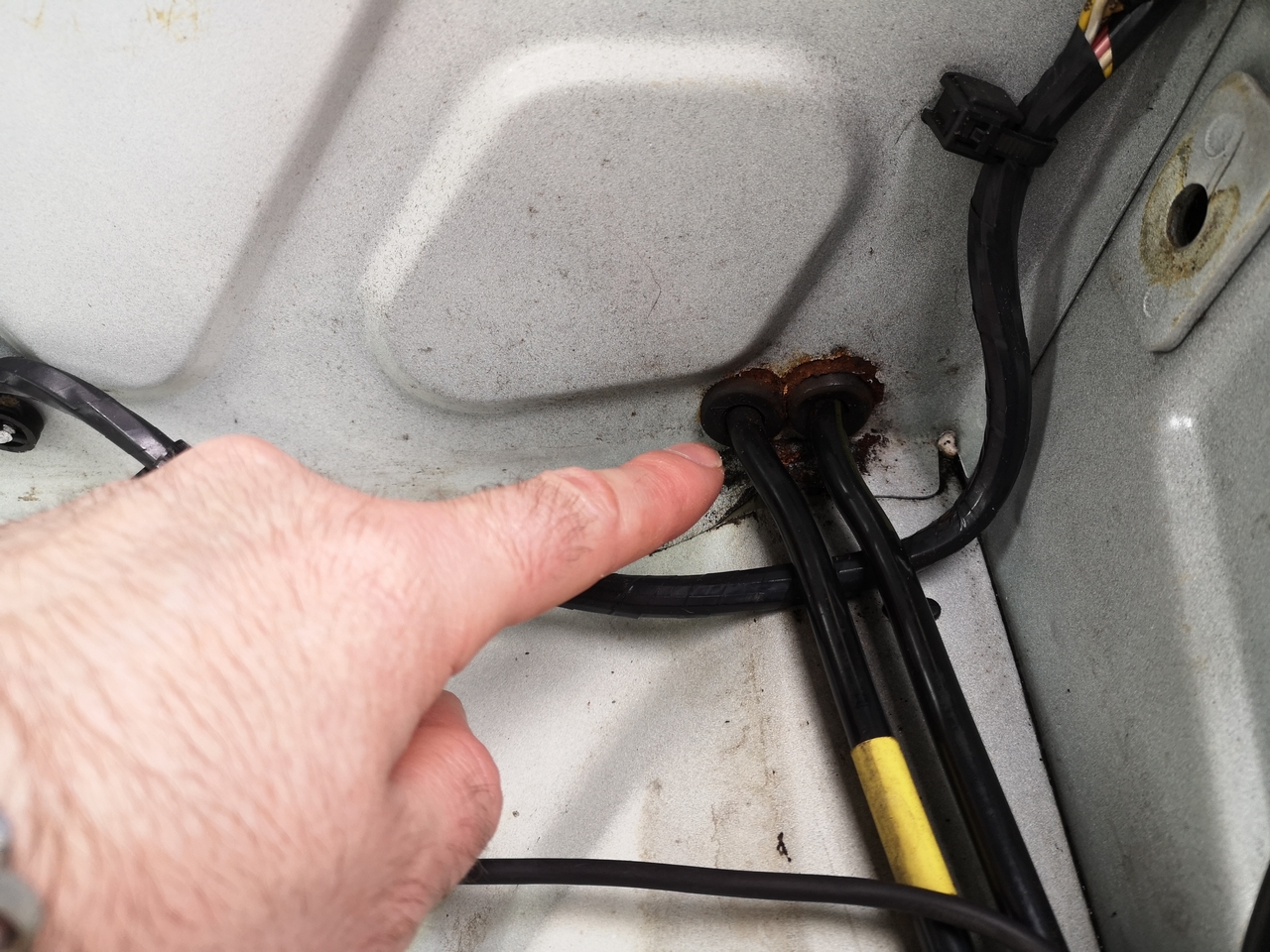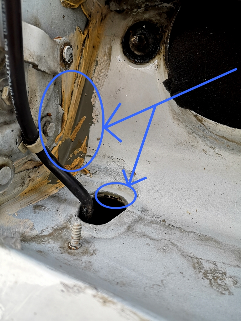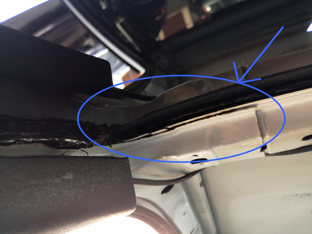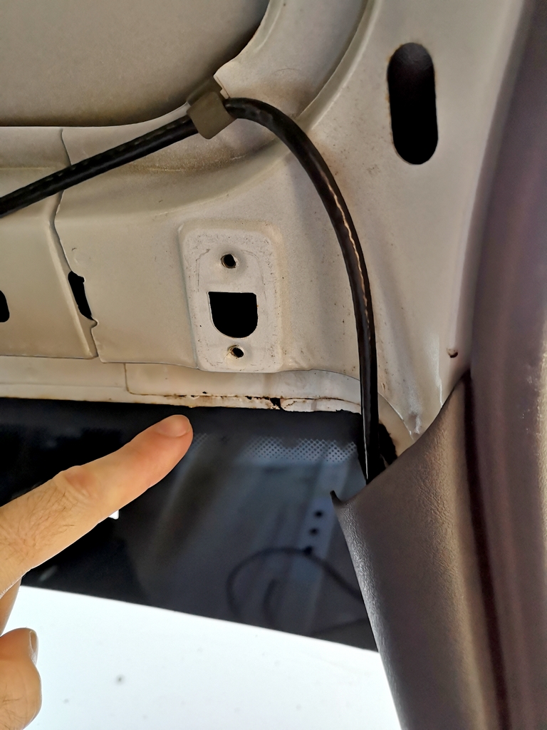 Ici en photo, le trou d’évacuation de l'eau de la baie de pare brise coté conducteur.